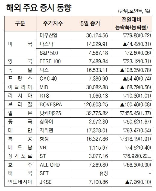 S&P 500 지수는 전일보다 2.60포인트(0.06%) 떨어진 4567.18로, 나스닥지수는 전일보다 44.42포인트(0.31%) 상승한 1만 4229.91로 장을 마감했다.