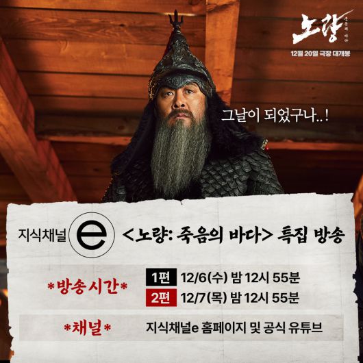 영화 '노량: 죽음의 바다'가 12월 20일(수)개봉을 앞두고 특별한 콜라보레이션을 진행한다. '노량: 죽음의 바다'의 역사적 배경을 관객들이 한번 더 알고 영화를 관람할 수 있도록 EBS의 간판 프로그램 '지식채널e'와 협업을 선언했다.