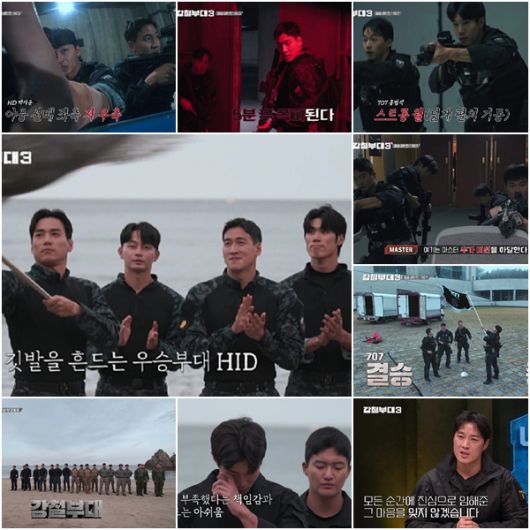 결국, 승부는 '폭탄 조끼 제거 완료시간'으로 가려지게 됐다. 잠시 후 최영재는 "707은 '폭탄 조끼 제거'까지 12분 40초, HID는 10분 35초가 걸렸다"고, HID가 최종 승리했음을 선포했다. 초박빙의 접전 끝 승리를 거둔 HID 강민호 팀장은 "부족한 팀장을 믿고 따라준 부대원들에게 너무 고맙다"며 울컥했다. 아쉽게 우승을 놓친 707 홍범석 팀장은 "끝까지 저를 믿고 함께해준 부대원들에게.."라면서 참았던 눈물을 쏟아내 모두를 먹먹하게 만들었다. 뒤이어 특전사, UDT, UDU 팀장들도 그간의 소회를 밝혔고, HID는 승리의 깃발을 높이 들어 흔들며 '강철부대3'의 찬란했던 여정을 마무리했다.