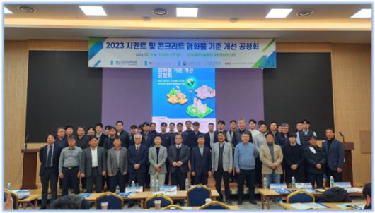 5일 한국과학기술회관 회의실에서 열린 '시멘트 및 콘크리트 염화물 기준 개선 공청회' 참석자들이 기념촬영을 하고 있다. [사진=한국시멘트협회] |