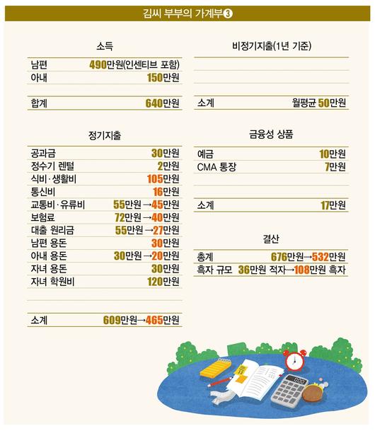 아울러 남편(40만원→30만원)에 이어 아내의 용돈도 10만원 줄였다. 아내는 아르바이트 근무지에서 점심을 해결하기로 했다. 월 55만원에 달하는 교통·유류비도 10만원 줄였다. 아이들이 입시를 준비해야 하는 만큼 가족 나들이 시간을 줄이고, 출퇴근에도 대중교통을 더 자주 사용하는 것으로 지출을 줄였다.