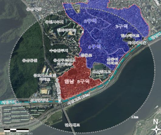 서울 용산구 한남5구역 재개발 위치도. 남산 조망 확보를 위해 높이계획이 일부 조정됐다. 서울시 제공 |