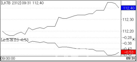 마켓포인트에 따르면 이날 오전 9시25분 기준 3년 국채선물(KTB)은 전 거래일 대비 15틱 오른 104.44를, 10년 국채선물(LKTB)은 57틱 오른 112.37을 기록 중이다.