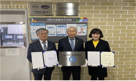조도순 국립생태원장(가운데)과 권영한 보전연구본부장(맨 왼쪽), 여정화 경영관리본부장이 안전관리 최우수연구실 인증서와 인증패를 전달받고 기념촬영하고 있다./국립생태원 |