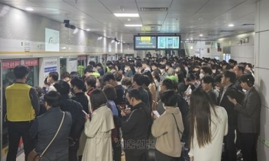 서울 강서구 김포골드라인 김포공항역이 퇴근하려는 승객들로 가득 차 있다. 2023.5.10 서울신문DB |