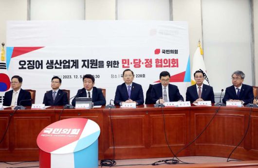 노동진 수협중앙회장(사진 오른쪽에서 두번째) 는 지난5일 국회에서 열린 민당정 협의회에서 위기에 처한 오징어 생산업계 상황에 대해 설명하고 있다. 수협 제공 |