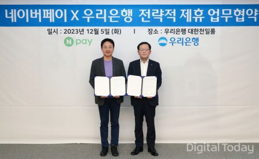 [디지털투데이 강진규 기자] 우리은행과 네이버페이는 지난 5일 서울 명동 우리은행 본점에서 '금융과 비금융 서비스를 융합한 데이터 연계사업 추진을 위한 전략적 업무협약'을 체결했다고 6일 밝혔다.