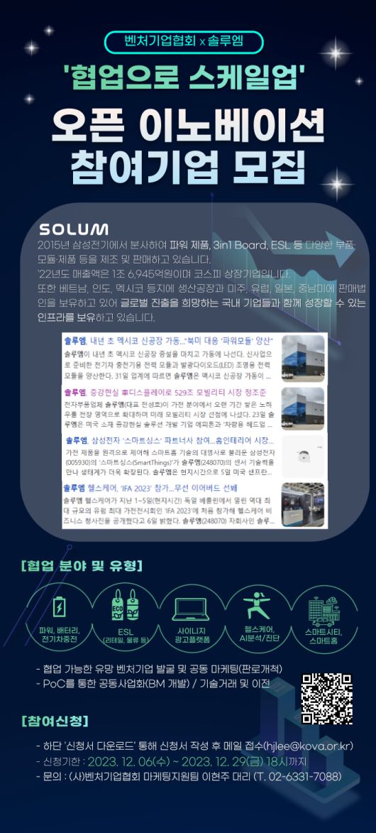 한편, 솔루엠을 비롯한 대·중견기업과의 오픈 이노베이션 문의는 벤처기업협회 마케팅지원팀으로 하면 된다.