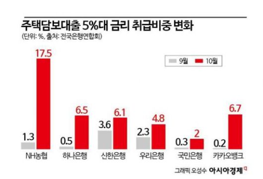 가장 많이 늘어난 곳은 NH농협으로 9월 1.3%에서 10월 17.5%까지 증가했다. 하나은행은 0.5%→6.5%, 신한은행은 3.6%→6.1%, 우리은행은 2.3%→4.8%, 국민은행은 0.3%→2%로 상승했다. 인터넷은행 중 카카오뱅크도 0.2%→6.7%로, 5%대 금리 비중이 급격히 증가했다.