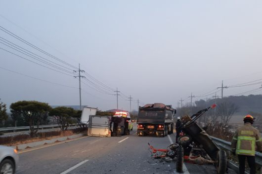 1톤 화물차가 경운기를 추돌하는 사고가 발생해 사상자 3명이 발생했다.
