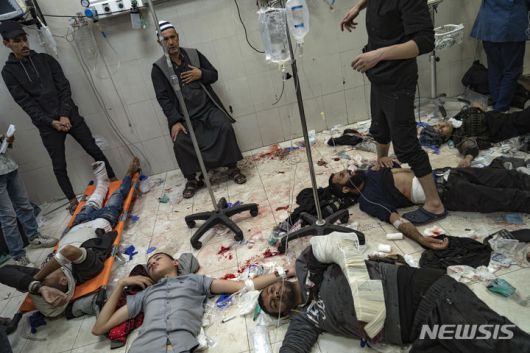 [가자지구=AP/뉴시스] 이스라엘의 폭격으로 부상한 팔레스타인 주민들이 5일(현지시각) 데이르 알발라의 병원 바닥에서 치료받고 있다. 하마스는 이스라엘의 가자지구 공격으로 인한 사망자 수가 1만6248명으로 늘었으며 그중 어린이가 7112명이라고 밝혔다. 2023.12.06. |