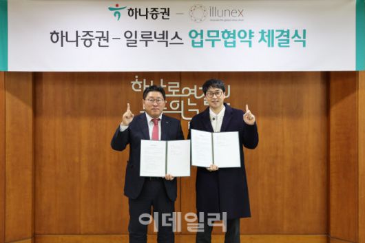 최원영 하나증권 디지털본부장(왼쪽), 박진혁 일루넥스 대표이사(오른쪽)가 협약식에 참여해 기념촬영하고 있다. (사진=하나증권) |