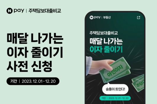 네이버페이가 연내 ‘주택담보대출 비교’ 서비스 출시를 예고하며, 주택담보대출 갈아타기(대환) 사전 신청 프로모션을 12월1일부터 20일까지(20일간) 진행한다.