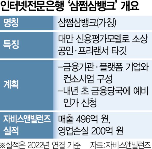 세금 신고·환급 지원 서비스 ‘삼쩜삼’을 운영하는 자비스앤빌런즈가 인터넷전문은행 설립에 도전한다. 금융기관·대형 플랫폼 등과 손잡고 컨소시엄을 구성해 내년 초 금융당국에 예비인가를 신청, 상반기 내 예비인가를 받는 것이 목표댜. 대안 신용평가모델을 개발해 시간제 근로자나 프리랜서 중 여러 개의 직업을 가진 ‘N잡러’나 소상공인을 주요 고객으로 확보할 계획이다. 금융당국이 ‘삼쩜삼뱅크’(가칭) 설립을 인가하면 케이뱅크, 카카오뱅크, 토스뱅크에 이어 네번째 인터넷전문은행이 탄생하게 된다.