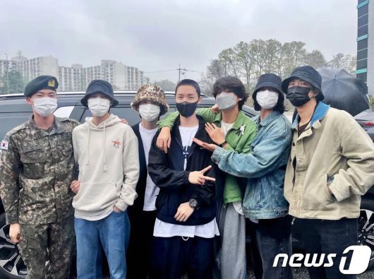 그룹 방탄소년단(BTS)의 제이홉이 18일 강원도 한 육군 사단 신병교육대로 입대한 가운데 멤버들이 배웅하며 기념촬영을 하고 있다. (방탄소년단 SNS 캡처) 2023.4.18/뉴스1 |