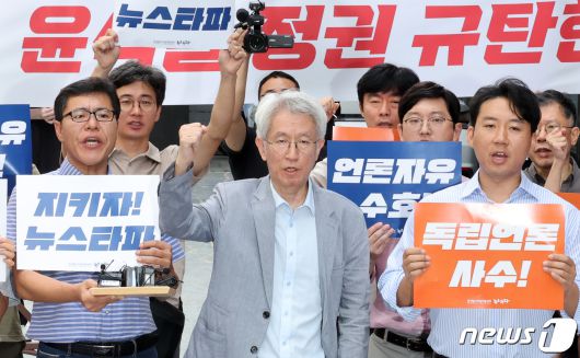 김용진 뉴스타파 대표와 직원들이 14일 오전 서울 중구 뉴스타파 본사 앞에서 서울중앙지검 대선 개입 여론 조작 사건 특별수사팀의 압수수색에 대해 입장문을 발표한 후 구호를 외치고 있다. 서울중앙지검 대선 개입 여론 조작 사건 특별수사팀은 지난해 대선을 앞두고 대장동 사건 관련 허위 보도를 한 혐의로 뉴스타파를 압수수색한다고 밝혔다. 2023.9.14/뉴스1 ⓒ News1 김성진 기자 |