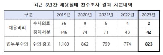 조사 결과, 대상 기관의 절반 이상인 454개 기관(55%)에서 여전히 채용 공정성 훼손 사례가 빈번히 발생했다. 권익위는 이번에 적발된 전체 867건 중 총 44건(68명)에 대해 수사의뢰와 징계요구했다. 이 중 법령을 위반해 채용에 개입하거나 영향을 주는 등 인사의 공정성을 현저하게 해친 2건에 대해서는 수사 의뢰했다.