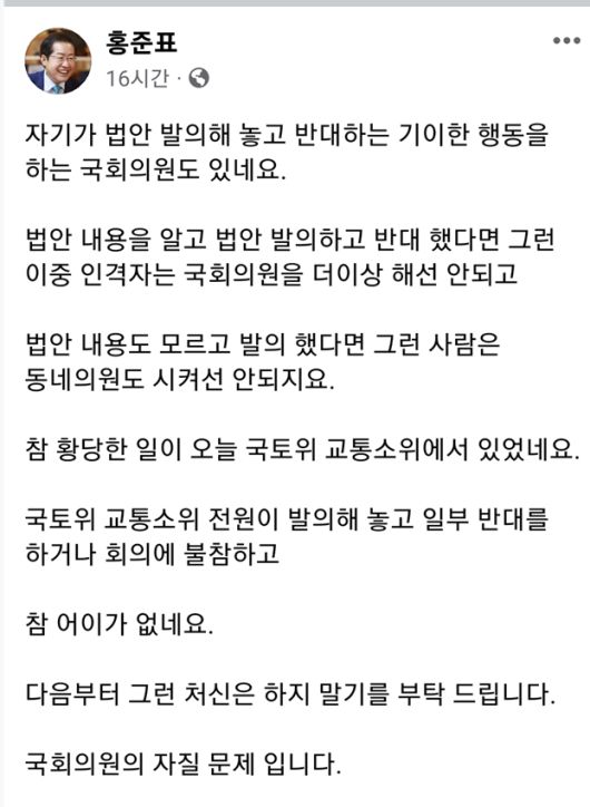 홍 시장은 자신의 페이스북을 통해 “자기가 법안 발의해놓고 반대하는 기이한 행동을 하는 국회의원도 있다”며 불만을 표출했다.