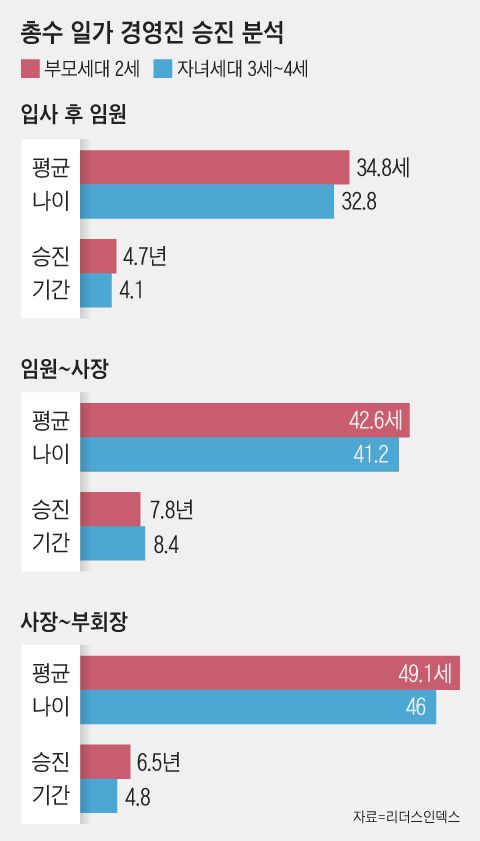 총수 일가의 임원 승진 속도는 창업 2세대보다 3~4세가 빨랐다. 입사부터 초임 임원이 되기까지 걸리는 기간은 경영 2세가 평균 4.7년으로, 34.7세에 임원에 올랐다. 후대인 3세와 4세는 이보다 0.6년 짧은 평균 4.1년이 걸려 2세보다 약 2년 빠른 32.8세에 임원으로 승진했다.