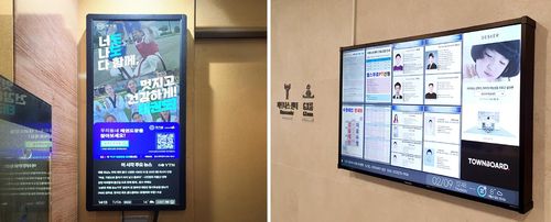 타운보드 세로형 모니터는 주로 아파트 엘리베이터에 설치돼 접근성이 좋고 정보 전달이 빠른 것이 장점이다.