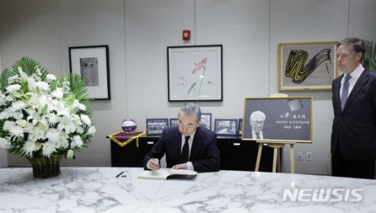 중국 외교부에 따르면 왕 부장은 이날 미국대사관을 방문해 조문록에 글을 적고 키신저 전 장관의 사망에 애도의 뜻을 표했다. 조문록에는 "키신저 박사는 중국 인민의 라오펑유(老朋友·오랜 친구)"라며 "중·미 관계 정상화를 위한 역사적인 공헌을 중국 인민은 영원히 기억할 것"이라고 썼다.