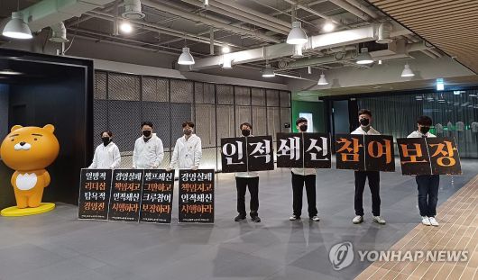 카카오 노동조합인 '크루유니언'이 4일 경기 성남시 카카오아지트에서 인적 쇄신과 크루(직원)의 경영쇄신 참여를 요구하며 피켓 시위를 벌이고 있다. 연합뉴스 |
