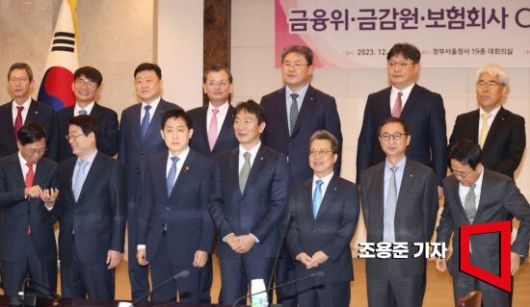 6일 서울 종로구 정부서울청사에서 열린 금융회, 금감원 보험업계 CEO간담회에서 김주현 금융위원장과 이복현 금감원장 등 보험업계 대표들이 기념촬영을 위해 자리를 잡고 있다. 이날 회의는 비공개로 진행됐다. 사진=조용준 기자 jun21@ <ⓒ투자가를 위한 경제콘텐츠 플랫폼, 아시아경제(www.asiae.co.kr) 무단전재 배포금지>