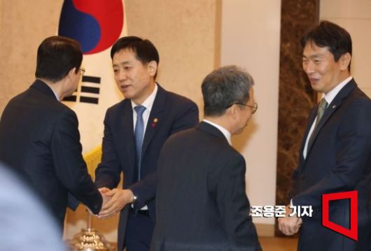 6일 서울 종로구 정부서울청사에서 열린 금융회, 금감원 보험업계 CEO간담회에서 김주현 금융위원장이 정희수 생명보험협회장과 악수를 하고 있다. 오른쪽은 이복현 금융감독원장. 사진=조용준 기자 jun21@ <ⓒ투자가를 위한 경제콘텐츠 플랫폼, 아시아경제(www.asiae.co.kr) 무단전재 배포금지>