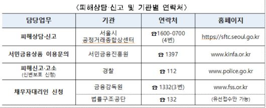 불법대출 피해를 입은 경우 시 공정거래종합상담센터로 신고해 도움을 청해야 한다. 센터는 상담자가 제출한 금융거래 내역을 토대로 이자율을 계산, 대출원리금보다 많이 상환했다면 부당이득금 반환이나 잔존채무 포기 등의 방식으로 피해자를 돕는다.