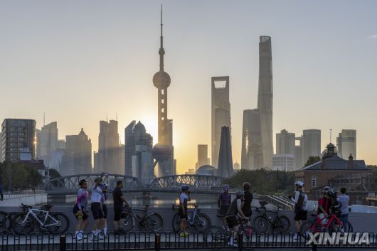 지난 3일(현지시간) 중국 상하이 금융·상업 중심지인 푸동을 배경으로 사람들이 휴식을 취하며 기념사진을 찍고 있다. [신화통신] |
