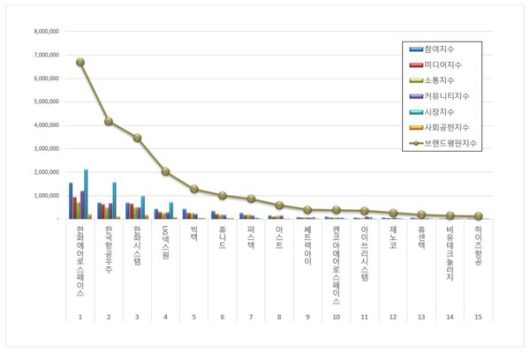 2위, 한국항공우주 브랜드는 참여지수 699,400 미디어지수 624,254 소통지수 495,457 커뮤니티지수 679,336 시장지수 1,574,899 사회공헌지수 103,241이 되면서 브랜드평판지수 4,176,587로 분석됐다. 지난 11월 브랜드평판지수 4,600,889와 비교해보면 9.22% 하락했다.