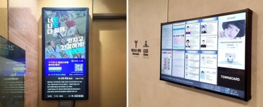 타운보드 세로형 모니터는 주로 아파트 엘리베이터에 설치돼 접근성이 좋고 정보 전달이 빠른 것이 장점이다. 자체 개발 콘텐츠부터 기업 광고에 이르기까지 다양한 소식을 입주민들에게 손쉽게 전달할 수 있어 서초구 래미안 원베일리, 송파구 리센츠, 부산 해운대 LCT 등 전국 대단지 아파트에서 600만 고객과의 소통 창구로 활용되고 있다.