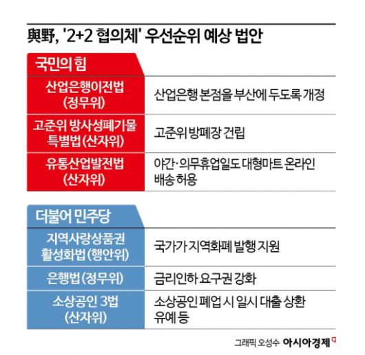 앞서 윤재옥 국민의힘 원내대표는 지난달 28일 협의체 구성을 제안할 당시 우선 처리할 법안으로 ▲워크아웃 제도를 3년 연장하는 '기업구조조정촉진법 개정안' ▲대형마트 온라인 배송 규제를 완화하는 '유통산업법 개정안' ▲50인 미만 사업장 적용을 2년 더 유예하는 '중대재해처벌법 개정안' ▲1기 신도시 특별법 ▲고준위방폐물관리 특별법 ▲우주항공청 특별법 등을 열거하며 "이런 법은 사실 거의 (합의) 접근이 가능하고 타결하기 위한 쟁점이 정리가 다 돼 가는 중"이라고 밝힌 바 있다.