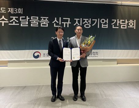 라웅재 아콘텍 대표(오른쪽)가 지난달 30일 김윤상 조달청 청장으로부터 자사 ‘슬림형 스마트 아크차단기’에 대한 조달 우수제품 인증서를 전달받은 후 기념촬영하고 있다. (사진=아콘텍) |
