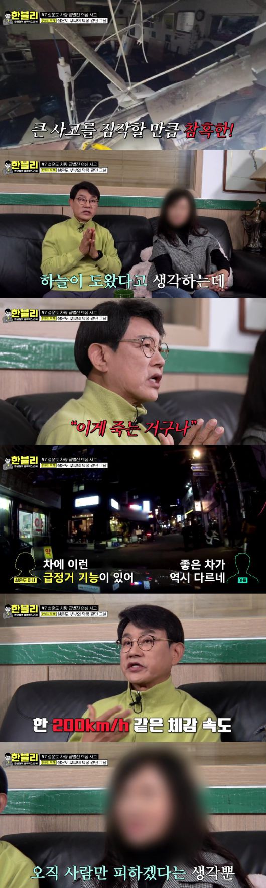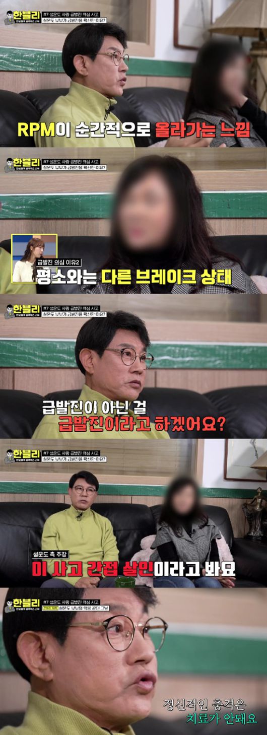 아내는 "양쪽으로 사람이 있었다. 인터넷 보니까 급발진 경우에 시동을 꺼라 기어를 바꿔라 하는데 그 생각이 안난다. 머리에 오직 사람만 피하자는 생각밖에 없었다"라고 고백했다.