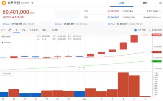 가상자산 거래소 업비트에 따르면 6일 오전 9시 기준 비트코인은 전일 동시간 대비 6.06% 상승한 개당 6023만1000원에 거래됐다. 지난 10월말부터 상승세를 탄 비트코인 가격은 최근 4일간 가격이 급등해 6000만원대를 재돌파했다. 비트코인이 6000만원대를 넘긴 것은 지난 2021년 12월 이후 처음이다.