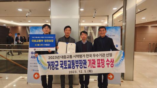 [거창=뉴시스]서희원 기자 = 경남거창군은 지난 5일 국토교통부가 시행한 ‘2023년도 대중교통시책평가’에서 전국 77개 군 중 3위를 차지해 국토교통부장관 기관표창을 수상했다고 6일 밝혔다.