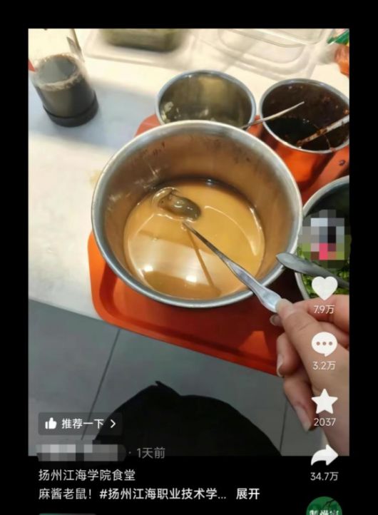 4일 하이보신문(海报新闻) 등 중국 언론 보도에 따르면, 지난 1일 동부 장쑤성 양저우의 장하이 직업기술대학교 구내식당 참깨 소스통에서 쥐가 발견됐다.