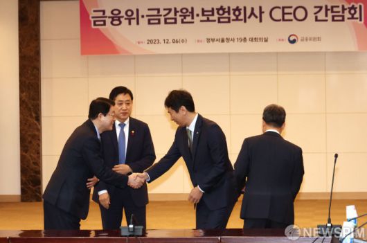 [서울=뉴스핌] 김학선 기자 = 김주현 금융위원장(왼쪽 두번째)과 이복현 금윰감독원장(왼쪽 세번째)이 6일 오전 정부서울청사에서 열린 금융위·금감원·보험사 CEO 간담회에서 정희수 생명보험협회장(왼쪽) 등 CEO들과 인사를 하고 있다. 이날 회의는 비공개로 진행됐다. 2023.12.06 yooksa@newspim.com