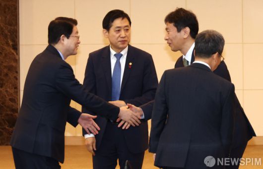 [서울=뉴스핌] 김학선 기자 = 김주현 금융위원장(왼쪽 두번째)과 이복현 금윰감독원장(왼쪽 세번째)이 6일 오전 정부서울청사에서 열린 금융위·금감원·보험사 CEO 간담회에서 정희수 생명보험협회장(왼쪽) 등 CEO들과 인사를 하고 있다. 이날 회의는 비공개로 진행됐다. 2023.12.06 yooksa@newspim.com