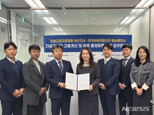[서울=뉴시스] 박성환 기자 = 한국어촌어항공단 동남해지사(지사장 강현상)와 건설근로자공제회 부산지사(지사장 곽윤주)는 지난 5일 공제회 부산지사에서 '어촌 활성화 및 지역 건설근로자 고용개선'을 위한 업무협약(MOU)을 체결했다고 6일 밝혔다.
