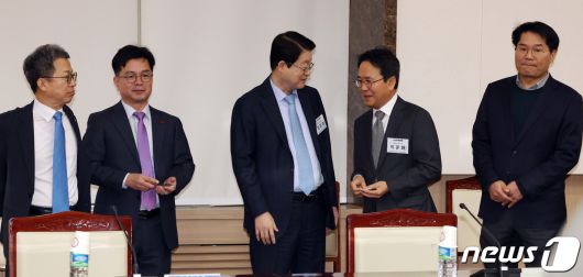 (서울=뉴스1) 김명섭 기자 = 정희수 생명보험협회장(가운데)이 6일 오전 서울 종로구 세종대로 정부서울청사에서 열린 금융위·금감원·보험회사 CEO 간담회에서 참석자들과 대화를 하고 있다. 2023.12.6/뉴스1msiron@news1.krCopyright ⓒ 뉴스1. All rights reserved. 무단 전재 및 재배포, AI학습 이용 금지.