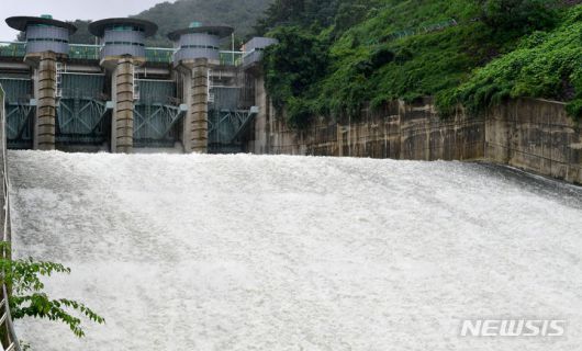 [장성=뉴시스] 신대희 기자 = 16일 호우경보가 내려진 전남 장성호 일부 수문이 개방돼 물이 방류되고 있다. 2023.07.16. sdhdream@newsis.com |