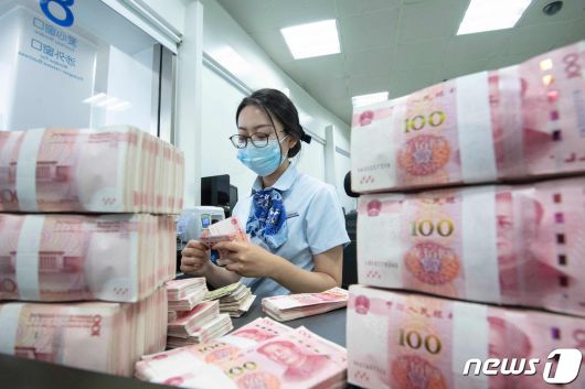 13일 중국 동부 장쑤성 난퉁의 한 은행 창구에서 은행 직원이 100위안짜리 지폐를 세고 있는 모습. 23.06.13 ⓒ AFP=뉴스1 ⓒ News1 김예슬 기자 |