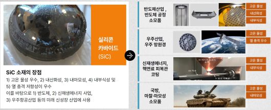 실리콘카바이드(SiC) 소재는 지구상에서 존재하는 세번째 강한 물질로써 내산화성, 내마모성, 우수한 고온물성, 내부식성 등의 특성으로 첨단 반도체 제조 및 우주환경, 소형원자로 구동 환경 등의 최첨단 산업분야에 적용되는 소재입니다. 우수한 소재의 물리화학적 특성으로 인해 가공 시 많은 제약이 있으며, 때문에 제조비용이 높고 제조시간이 오래 걸린다는 단점이 존재했었습니다.