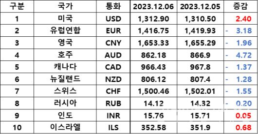 [스타데일리뉴스=서태양 기자] 오늘 6일, 빅데이터 실시간 분석엔진 랭키파이 환전고시 환율 정보이다.