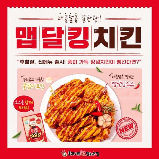 6일 회사에 따르면 후참잘이 신메뉴로 선보이는 '맵달킹치킨'은 매콤 달콤한 양념치킨에 함께 제공되는 부드럽고 고소한 '불닭마요킹소스'를 직접 뿌려먹는 메뉴다. 기존의 양념치킨과 다른 맵달킹 특제 양념소스에 불닭마요킹소스의 조화로 비주얼뿐만 아니라 맛까지 잡았다.