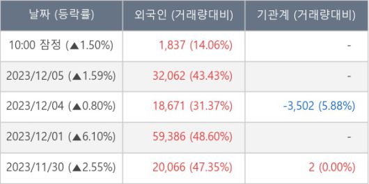 [서울=뉴스핌] 로보뉴스 = 06일 10시 15분 현재 가비아(079940)는 전일 대비 1.50% (현재가 15,540원) 상승했고, 외국인이 최근 6일 연속 순매수(누적 13.65만 주, 잠정) 행진을 하고 있다.