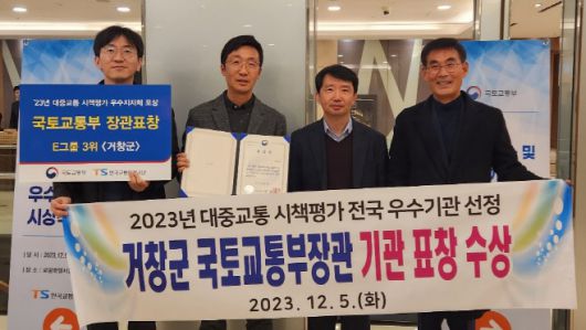 아시아투데이 박현섭 기자 = 경남 거창군은 국토교통부가 시행한 '2023년도 대중교통시책평가'에서 전국 77개 군 중 3위를 차지해 국토교통부장관 기관표창을 수상했다고 6일 밝혔다.