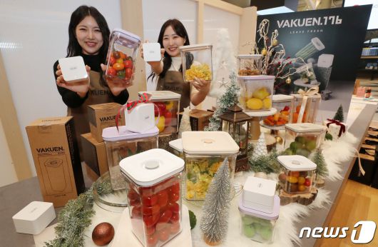 (서울=뉴스1) 박세연 기자 = 6일 서울 강남구 신세계센트럴시티 오픈스테이지에서 열린 진공주방용기 바퀜 브랜드 전시회 ‘타임 오브 바퀜’에서 모델들이 공기를 빼내는 방식의 진공 기술로 최대5배 보관기간을 늘려주는 제품을 선보이고 있다. 이번 브랜드 전시회는 10일까지 진행된다. 2023.12.6/뉴스1